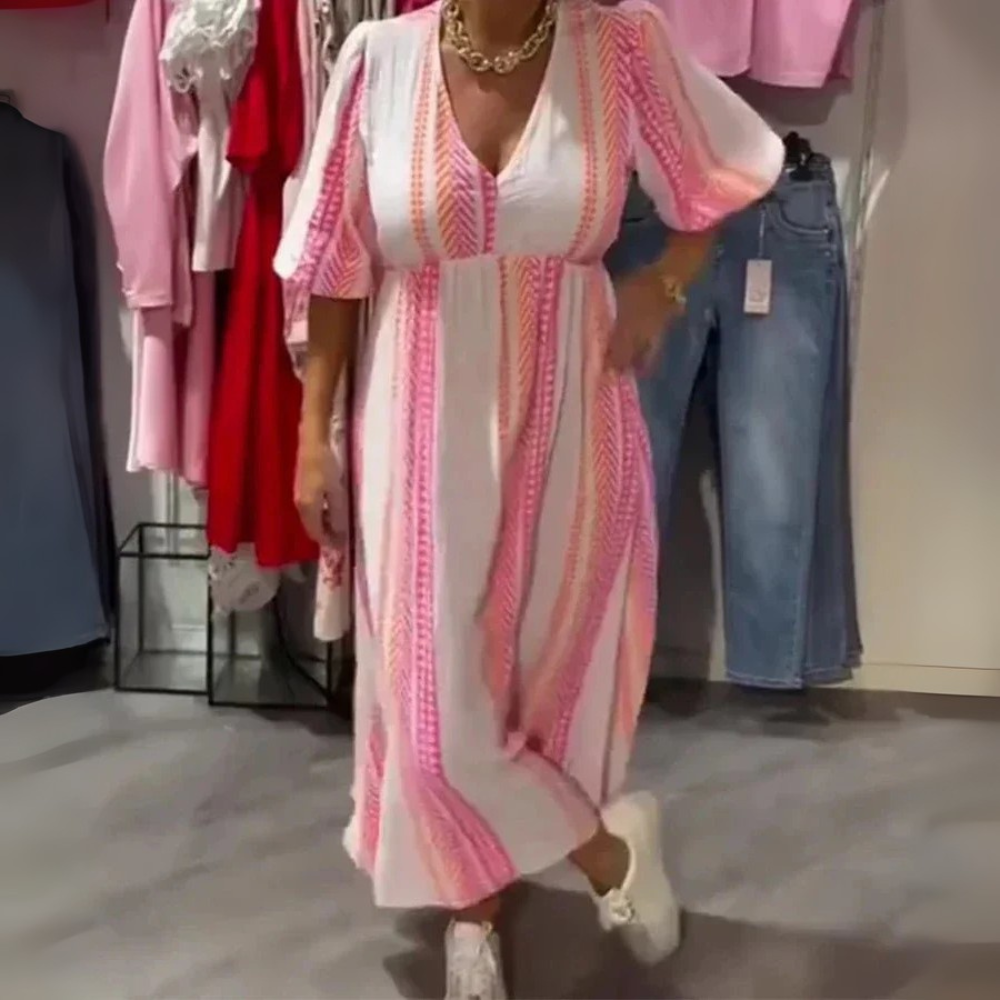 Voel je licht en stijlvol met de Milana™ jurk – een vrouwelijke maxi-jurk met een sierlijke V-hals, rechte rok en luchtige pasvorm. Perfect voor warme dagen waarop je moeiteloos elegant wilt zijn, van vakantie tot zomerse brunch.